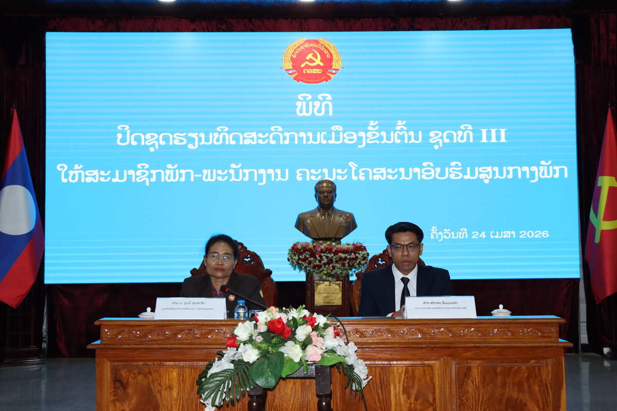 ໃນຕອນເຊົ້າຂອງວັນທີ 24 ເມສາ 2026 ຄະນະໂຄສະນາອົບຮົມສູນກາງພັກ ໄດ້ສົມທົບກັບ ສະຖາບັນການເມືອງ-ການປົກຄອງແຫ່ງຊາດ ຈັດພິທີປິດຊຸດຮຽນທິດສະດີການເມືອງຂັ້ນຕົ້ນ ລະບົບ 03 ເດືອນ ຊຸດທີ III ໃຫ້ແກ່ສະມາຊິກພັກ-ພະນັກງານ ພາຍໃນຄະນະໂຄສະນາອົບຮົມສູນກາງພັກ, ພາຍໃຕ້ການເປັນປະທານຮ່ວມ ແລະ ກ່າວປິດພິທີຂອງ ສະຫາຍ ສາຄອນ ພົມມະລາດ ກຳມະການຄະນະພັກ, ຮອງຫົວໜ້າຄະນະໂຄສະນາອົບຮົມສູນກາງພັກ, ແລະ ສະຫາຍ ນ. ບຸນມີ ຈຸນລະຈັກ ຮອງຫົວໜ້າສະຖາບັນການເມືອງ-ການປົກຄອງແຫ່ງຊາດ ເຂົ້າຮ່ວມມີ: ບັນດາຕາງໜ້າກົມ ພາຍໃນ ຄະນະໂຄສະນາອົບຮົມສູນກາງພັກ, ຮອງຫົວໜ້າກົມຄຸ້ມຄອງການຮຽນ-ການສອນຈາກສະຖາບັນການເມືອງ ແລະ ການປົກຄອງແຫ່ງຊາດ, ຕາງໜ້າຈາກປ້ອງກັນສູນກາງ, ຄະນະຮັບຜິດຊອບຊຸດຝຶກອົບຮົມ ແລະ ນັກຝຶກອົບຮົມທັງໝົດ 39 ສະຫາຍ,ຍິງ 19 ສະຫາຍ.