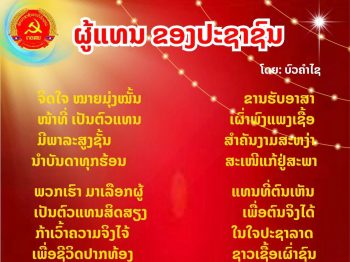 50 ປີ ສປປ ລາວ ຊາດລາວ ຊົນຊາດເຊື້ອ ຂຶ້ນຊື່ລືນາມ ມີປະຫວັດສາດຫຼາຍພັນປີ ປະກົດໃນໂລການີ້ ປະຊາຊົນ ມີມູນເຊື້ອ ຂະຫຍັນພຽນດຸໝັ່ນ ສາມັກຄີຮັກໝັ້ນ ໂຮມຕຸ້ມເຜົ່າປະຊາ